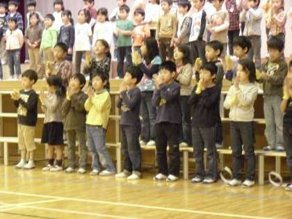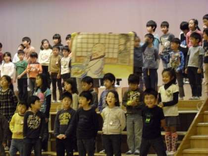 1年生は「むかしばなしがはじまるよ」を発表します。和尚さんと小僧のとても楽しいお話です。1年生は初めての舞台発表なので、入場するときは並んで歩き、舞台に立ったら静かに待つことや自分のセリフを言うときは、会場に体を向けて大きな声で言うことなど先生から教わっていました。練習を積むにつれ、台詞も間違えず上手に言うことができるようになりました。とても元気でかわいい動作や台詞、歌声を楽しみにしてください。