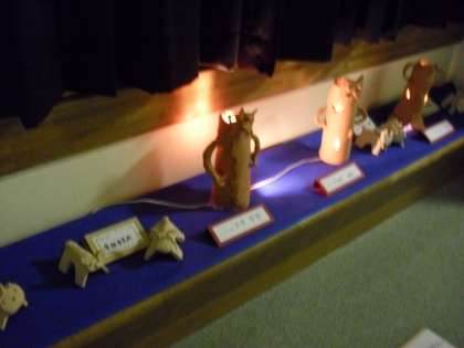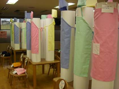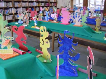 5年生は、「糸のこドライブ」工作は、不思議な形を切り取った色とりどりの作品が並んでいました。どんなことを想像して切り取ったかを考えるとおもしろいです。また、「ゆかいななかま」焼き物は、2階廊下のベンチの上の作品の中からほのかな明かりが漏れ、不思議な形をしたなかまをつくり上げていました。家庭科作品「エプロンと帽子」では、初めて使ったミシンに苦労した様子がうかがわれます。