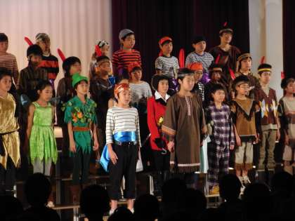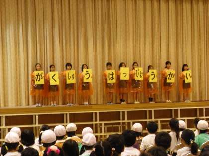 本日の「学習発表会」保護者鑑賞日には大勢の保護者並びに地域の方々がご来校されました。保護者950名、来賓・地域の方々70名弱お越しいただきました。子どもたちは今日もはりきって演じていました。昨日の時点で、台詞が早く何を言ってるか分からないところがありました。そこで今日は、聞く側が分かるように口を大きく開け、はっきりと発音するように修正されていました。演じた子どもたちもとても満足そうでした。たくさんの声援ありがとうございました。なお、作品展示は来週12月2日(木)まで開催しています。写真は、3年生のはじめの言葉、6年生の終りの言葉です。