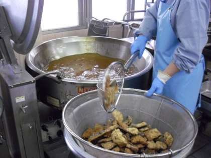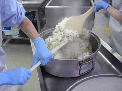本校の給食室では、本校児童・教職員分、玉川中学校分、中里小学校分合わせて970食以上を作っています。福島栄養士を中心に、すえひろの社員14人が朝早くから役割分担や手順の打ち合わせを行い、材料の仕入れ、仕込み、調理、盛り付け、配送、片付け等を行っています。今日は、給食室の中の様子を紹介します。今日のメニューは、「さといもとわかめのごはん」、「牛乳」、「さばのたつたあげ」、「肉団子スープ」です。