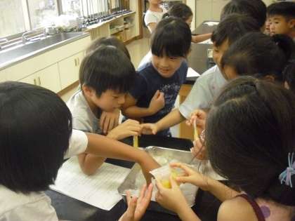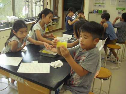 23日。高温注意情報が発令され、3回目のプールは中止になりました。そんな暑い日でも科学の力で涼しくなろうと、実験教室が行われました。身の回りにある、食用の重曹・クエン酸、塩、尿素(園芸肥料として存在します)などを紹介しながら、ひんやり感じる仕組みをいろいろな実験で楽しみました。「家の人に作ってあげたい!」「また、実験したい!」とうれしい感想がたくさん出ました。同じように見える白い粉でも、水を加えると、泡が出たり、ひんやりしたりと反応が様々です。暑い夏も身近にある不思議を楽しんで過ごしてほしいです。