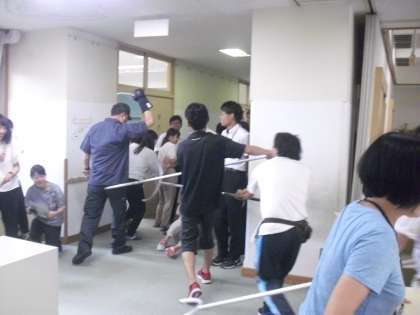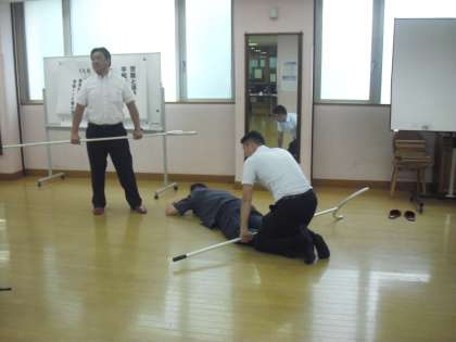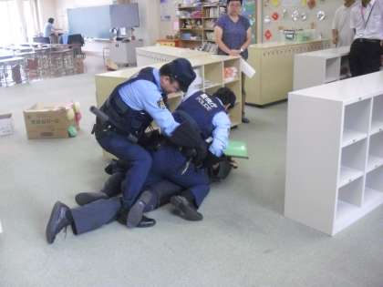 2日。夏休みですが、先生方は様々な研修を受け2学期以降の準備をしています。今日は、7・8ブロックの先生方が中町小学校で学校防犯訓練を行いました。実際に不審者が教室に入ったと想定した訓練で、中町の先生方が中心になって行いました。玉川警察署の方から、さすまたの効果的な使い方や不審者対応、安全に児童を避難させるポイントを教えていただきました。もちろん、不審者が入らないことが大前提ですが、何があっても子ども達を安全に避難させる、守り抜くと強く思った訓練でした。