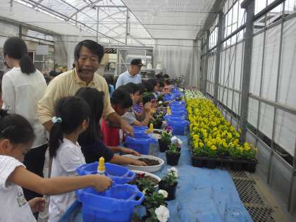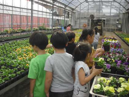 12日。1・2年生の子どもたちが世田谷ファームさんで寄せ植え体験をしました。根が傷まないように細心の注意を払って、自分の鉢にビオラやパンジーの苗を植え替えました。いつも花いっぱいの中町小学校ですが、さらに1・2年生の教室横は華やいでいます。