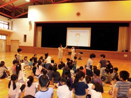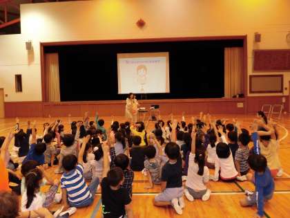 12日。日本成人病予防協会の方が講師になって1年生に出前授業を行ってくださいました。口から入った食べ物が栄養となって体を作ります。その残りかすがうんちですが、このうんちを見ると自分の体の状態がわかります。日中、元気に遊び、しっかり睡眠をとる、三食バランスのとれた食事をとるという規則正しい生活習慣が身についている体からはバナナうんちがでます。野菜や水分摂取が不足したり、脂肪分が多かったりするとコロコロうんちやべちょべちょうんちが出てきます。子どもも大人も、質の良い睡眠、運動習慣、バランスの良い食事でバナナうんちを出していきましょう。