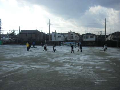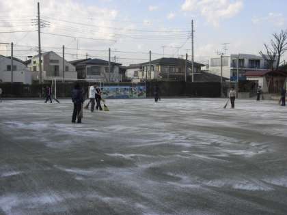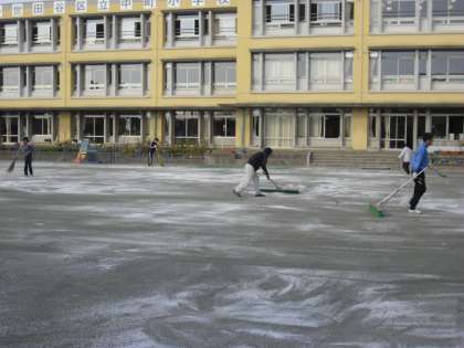 12月24日(金)に校庭整備を行いました。冬の間に校庭の土が凍らないように塩化カルシウムをまきました。まいたものは白い粉状なので、まるで雪が降り積もったようになりました。