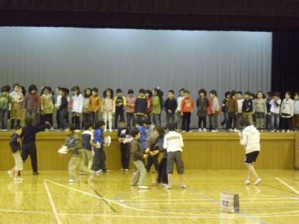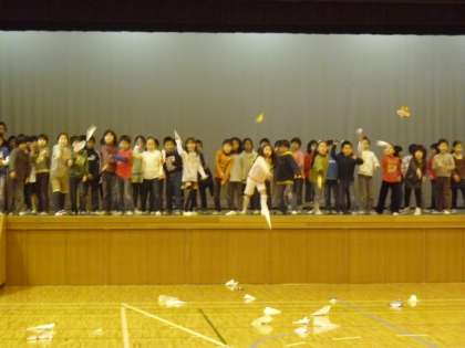 1月20日(木)、集会委員会による「紙飛行機集会」が行われました。学年ごとに体育館のステージからできるだけ遠くに飛ばします。なかには体育館の半分以上も飛んだ飛行機もあり、大きな歓声がわきました。