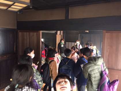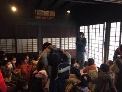 民家園に到着しました。昔の家に入り、昔の生活の説明を聞きます。