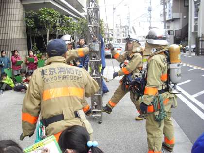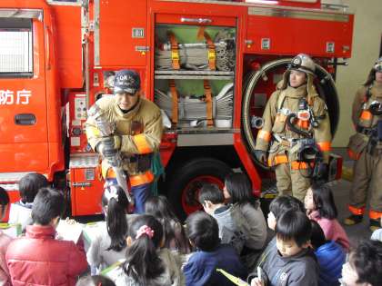 3年生は、玉川消防署を見学しました。社会科で、消防署のはたらきを勉強しています。消防署が日常行っている消火訓練の様子(隊員の方の着替えや出動、はしご車の出し方)を見せていただきました。また、ポンプ車についてお話していただきました。実際に火事が起こった場合、消火活動をどのようにするかもお話していただきました。消火と同時に人の救助も行っているそうです。1月は、空気が乾燥していて、火事が起こりやすくなっています。火事に十分注意したいと思いました。