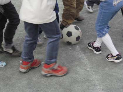 2月10日(木)の児童集会は「わくせいドリブル」でした。グループになってサッカーボールをドリブルリレーします。みんな仲良く手をつないで、はやくボールを運ぼうと一生懸命でした。