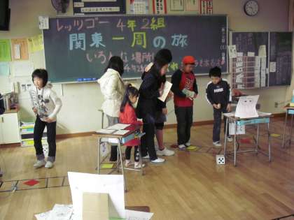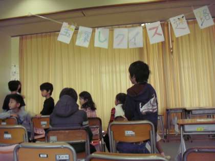 4年生、1組「宝探しクイズめいろ」、2組は「4年2組関東一周の旅」です。1組は、カーテンで仕切った迷路を通ると学年ごとのクイズを出します。最後まで、ゴールまでたどり着くことができるでしょうか。2組は、社会科で学んだ関東地方の県庁所在地の双六です。簡単な問題や難しい問題など解答するのを楽しんでいました。