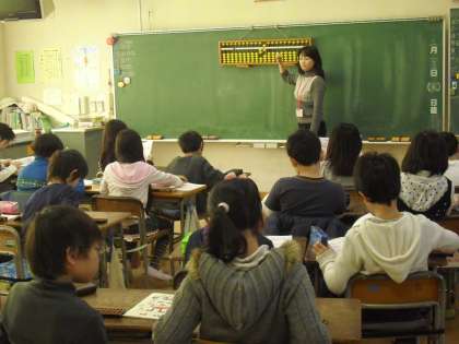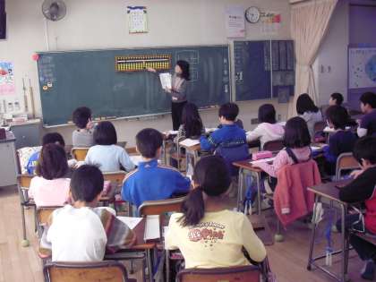昨日から3年生はそろばんの学習をしています。珠算専門の先生をお呼びして、集中的に授業をすすめています。玉をおくところから始めて、今日は3桁のたし算やひき算にチャレンジしました。