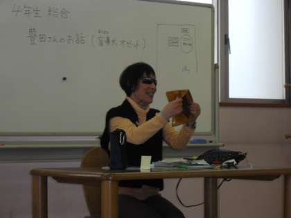 5時間目、総合の学習で、「盲導犬ユーザー」の豊田さんから、お話を聞きました。目が不自由になった原因や、盲導犬「オゼット」との出会い、お家での生活、外出の際はどうされているか、いろいろなお話を伺いました。