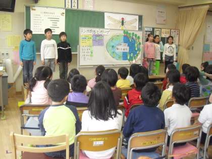 3年生は、この1年間、専門家から指導を受けながら、ビオトープを作り、管理してきました。ビオトープに集まる昆虫や水辺の植物を観察しました。来年は2年生がビオトープの学習をします。そこで、今日は3年生がビオトープを通じて学んだことを2年生に発表しました。発表を聞いた2年生は、メモもとっていないのに発表内容がほとんど頭に入っているようで、今からビオトープで学習することが楽しみなようです。