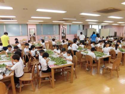 1年生が、本日の給食で調理する「そらまめ」の皮むきをしました。「きれいにむけた!」「中がふわふわ」と、夢中になってむいていました。