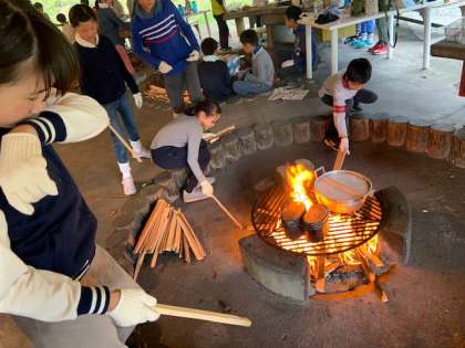 飯盒炊飯カレーライスづくりが始まりました。みんな案外上手?かな。煙さにやられています。