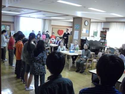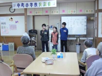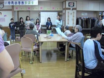 5年生は、クラスごとにディホーム中町との交流を行っています。今回5年2組は、お年寄りに楽しんでいただこうとみんなで考えた出し物を披露しました。お年寄りは、一つひとつの出し物をとても喜んで見てくださいました。また、将棋などを通して交流しました。