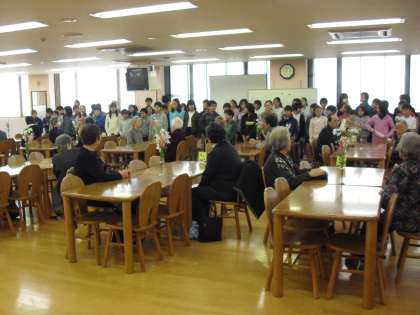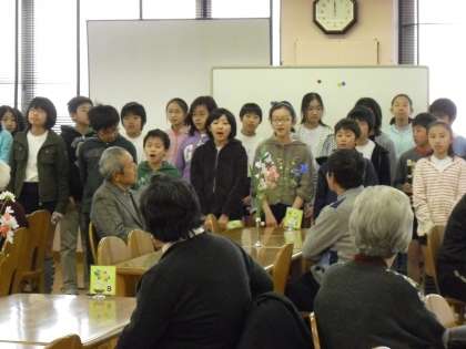 5年生は、中町4・5丁目町会の不老会と交流しました。28人の方々を招待し、今まで学習した日本語の暗誦や合唱・合奏などを披露しました。その後、一緒に給食をいただきました。普段、お年寄りとお話しする機会の少ない子が多いので、最初は緊張していましたが、だんだん打ち解けて、和やかな会食となりました。また、先日の「ディホーム中町」との交流も生かすことができました。