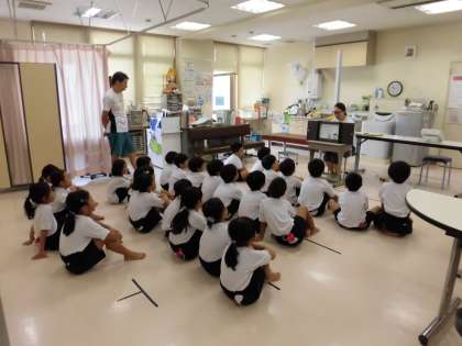 学期はじめの計測をしました。低学年は、「げんきくん」という紙芝居をみて、朝から元気に過ごすために大切なことを話ました。