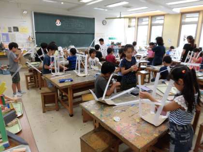 図工の時間。自分の作りたいものをホチキス、カッターを使って製作に取り組みました。