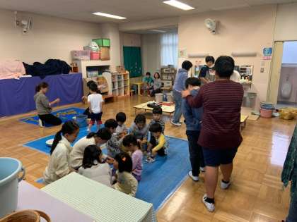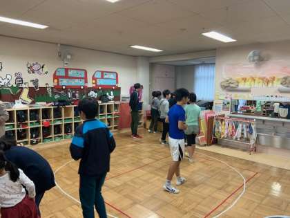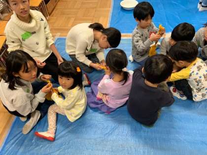 各クラスごとに幼稚園年少組と交流しました。年少組では草木染めをしていました。そのお手伝いをしてきました。優しく次に何をするのか説明したり、困っている子の話を聞いて助けたりする姿が見られました。