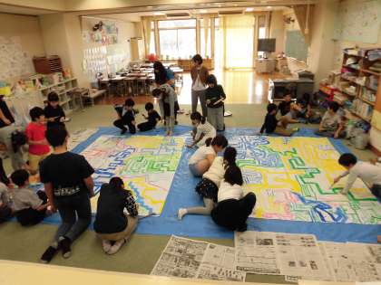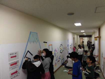 今日から、学校公開、展覧会が始まりました。展覧会は本校で初めての学校行事となりました。1日目は、たてわり班ごとに創作活動を行いました。学校全体が、図工室になり、それぞれの活動に夢中になって作品作りを楽しみました。体育館の作品展と同時に、校内のたてわり活動の作品もお楽しみください。