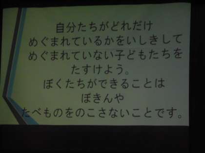 今日は、ユニセフ集会を全校で行いました。学び舎委員会の児童が寸劇、パワーポイントを使って、活動内容、世界の状況、自分たちにできることをみんなに伝えることができました。募金活動は1月14日〜17日です。