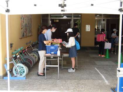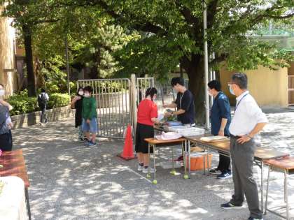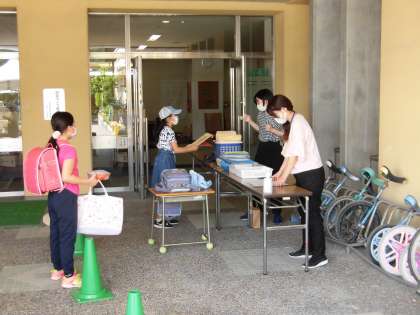 5年生課題受け渡しです。少し緊張した様子で登校しています。ご協力ありがとうございます。