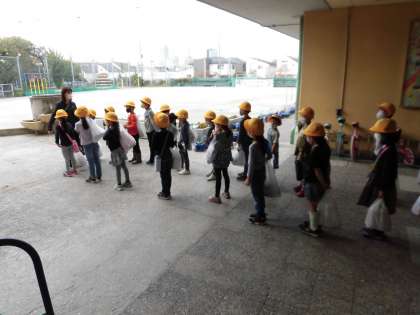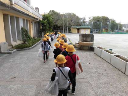 今日は、1年生が近くの畑へいもほり体験に行きました。どんなおいもがとれるのか、楽しみにしていてください。小学校に入って、みんなで校外を歩くことが初めてなので、安全に歩くこともめあてにして出かけました。