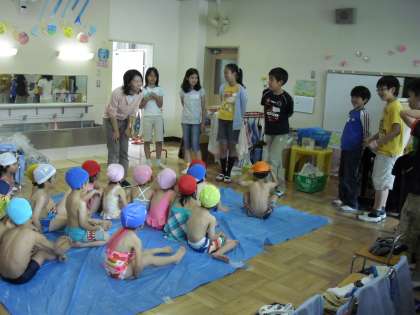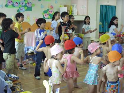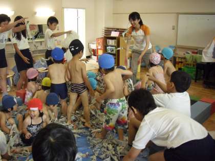 プールに入る練習のために、水着の着替えを手伝ったり、音楽に合わせて一緒に体操したりしました。天気が悪くて、本物のプールには入れなかったので、新聞紙をちぎってお水に見立てたプールごっこをして遊びました。