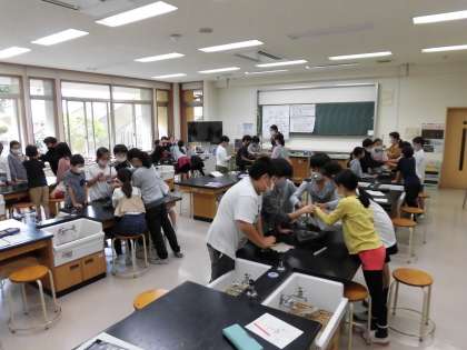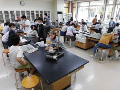 理科室では実験を行いました。「水の3つの姿」を学習しました。フラスコに入れた水をガスコンロで熱して、時間を計りながら、温度の上がり方を調べて記録しました。安全第一でグループで協力して行いました。