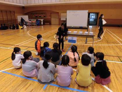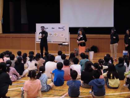 本日は、4年生英語・多文化体験教室がありました。本来でしたら、教育センターでの実施する予定でしたが、新型コロナウイルス感染症対策の一環で、出張型体験活動となりました。ALTの先生6名、講師の先生1名が来校され、体育館でブースに分かれて各活動を行いました。