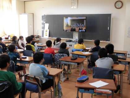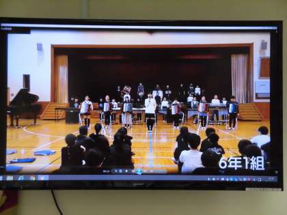 本日は、校内テレビ放送で音楽朝会をしました。先日、6年生が合奏した映像を鑑賞しました。校内テレビでの音楽朝会は始めてでしたが、他学年のクラスではしっかりと鑑賞していました。