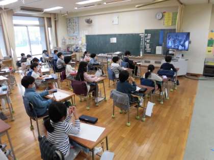 本日は、警察署の方1名に来校いただき、セーフティ教室を行いました。警察の方は放送室で、映像を流し、講話をしていただきました。子どもたちは、各教室でテレビを視聴しました。「いかのおすし」のことを中心に学習をしました。
