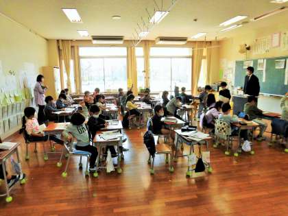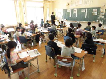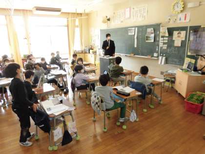 1年生は、東日本大震災後の鉄道を復興する話をもとに、かかわる人たちの気持ちを考えました。線路沿いを歩く人、線路を直す人、旗をふる子どもたち、それぞれの気持ちを考え、意見を交換しました。