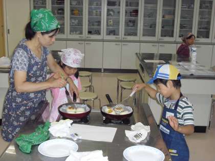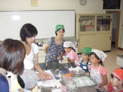 7月24日(日)今日はふれあい教室で「パン作り教室」がありました。西野さんに指導いただき、楽しくパン作りをしました。生地作りからはじまり、フライパンで焼いて完成です。「早く食べたいよ」とてもおいしく仕上がりました。