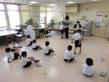 校庭では、低学年が2クラス合同の体育をしていました。校庭をおにごっこで走っていました。