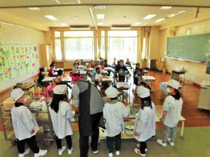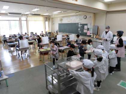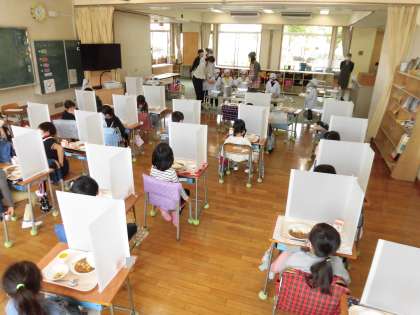 本日は、1年生にとって小学校初めての給食でした。給食当番、前向き並び、食べるときはパーテーションを設置しました。メニューはカレーライスでした。準備、時間までに食べる、後片付けを自分たちで頑張ります。