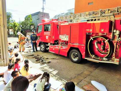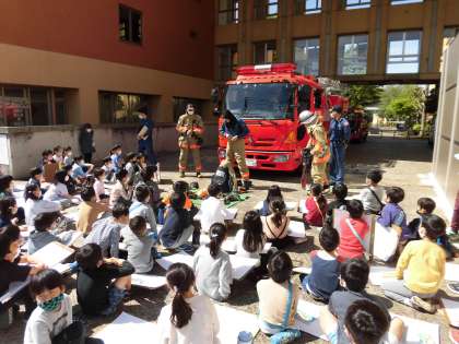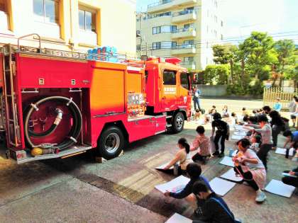 今日は、消防車が来校し、写生会を行いました。赤いぴかぴかの消防車をみると「わあー!」「大きい」と子どもたちの声が聞かれました。速く着替えるデモンストレーションも披露していただきました。大きな画用紙に消防車をじっくりと見て描いていました。