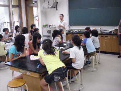7月29日 今日のふれあい教室は「アロマ工房」でした。60名程の子どもたちはほとんどが女の子。山岸さんに作り方を教えてもらいながら、何種類ものお花から取りだしたにおいのもとから、好きな香りを選んでルームスプレーを作りました。みんなうれしそうな顔をしていました。