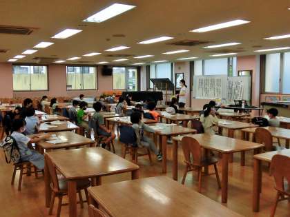 低学年の音楽は、広いランチルームで行っています。打楽器やピアノもランチルームにあります。一人一人のスペースを広くしています。教室はオープンスペースなので、楽器をならすときはとてもよい空間です。