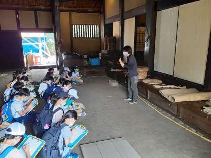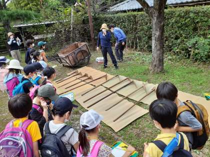 昔の道具の説明をグループにわかれて聞いています。