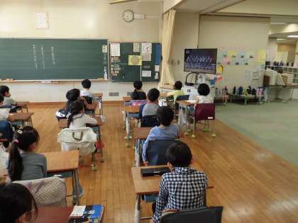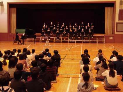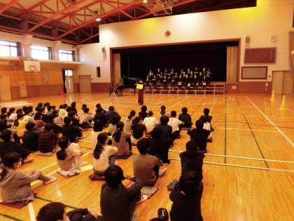 今朝は、玉川中学校の合唱(選抜メンバー)を聞かせていただきました。6年生は、会場で、1〜5年生は教室テレビでそれぞれ、中学生の響き渡る歌声にじっと耳を傾けていました。