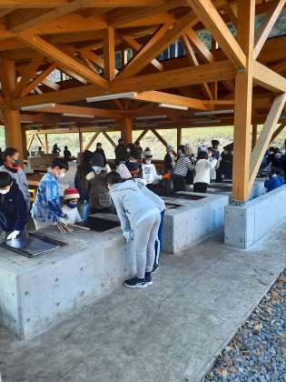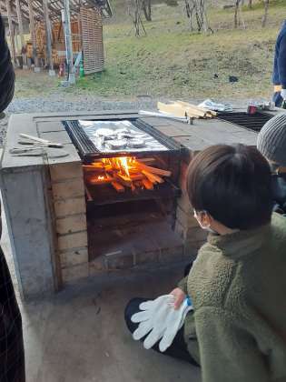 風が冷たく感じられるようになりました。焼きリンゴ体験が始まりました。薪を組んで、着火しています。出来上がりが楽しみです。