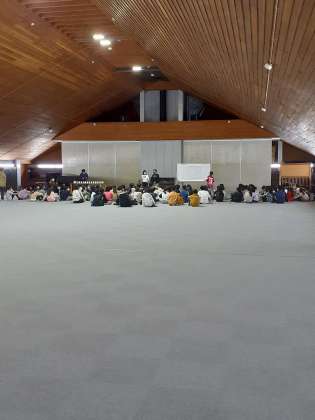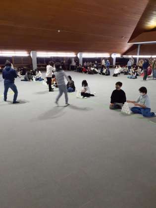 室内レクが始まりました。まずは、コップ積み競争です。レク係が進行を頑張っています。