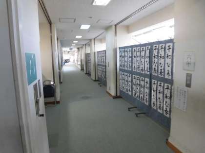 校内には、各学年の書初めを掲示しています。密にならないように廊下に掲示しています。