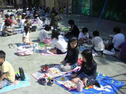 きのうは体育集会で「長なわ大会」を全校児童で楽しみました。三分間で何回跳べるかに挑戦です。きょうは縦割り班ごとに校庭で全員でお弁当給食を味わいました。おだやかな天気に恵まれ、眠くなるようなあたたかい日でした。