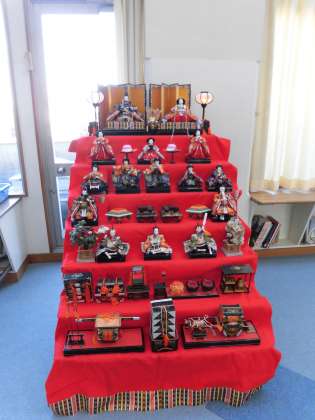 3月はまだ先ですが、おひな様を飾りました。場所は、2階図書室前の多目的スペースです。同じ階の3,4年生はもちろんですが、1,2年生、5,6年生も見に来ていました。