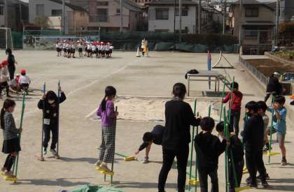 2年生は、竹とんぼや竹うまをして楽しみました。どうやったら、高く飛ばせるか、低く飛ばすとどのように飛ぶかなどいろいろ試しながら楽しんでいました。竹うまは、得意な子がこつを教えていました。