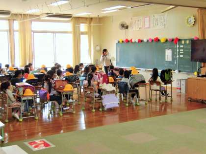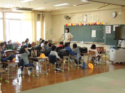 1学期が始まりました。担任と子供たちが教室で出会いました。1年生は、6年生に朝の支度を手伝ってもらい、学校生活を学んでいきます。教室では担任の話を聞いていました。