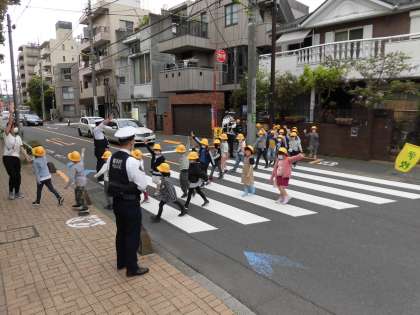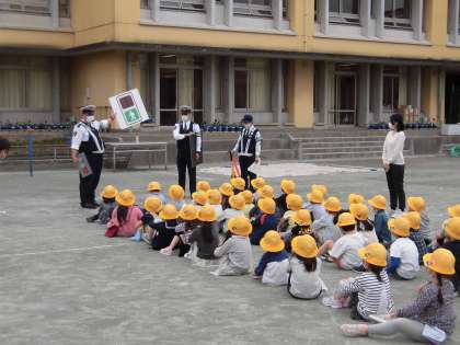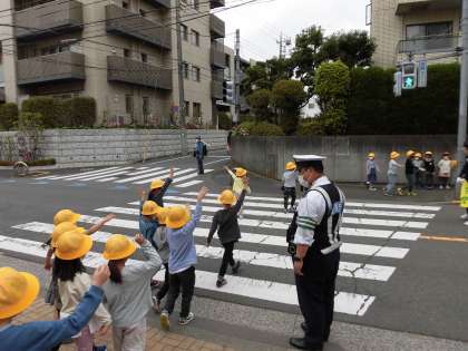 1年生は、玉川警察署の方々より、安全な歩行の仕方について学習をしました。校庭で話を伺ったあと、実際の道路で、信号機のあるところ、信号機のないところの歩行を行いました。1年生は、右左右の確認、手を挙げて歩行することをしっかりと行うことができていました。